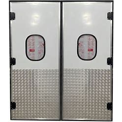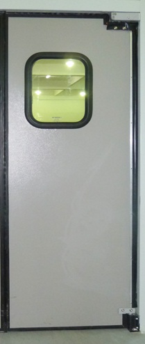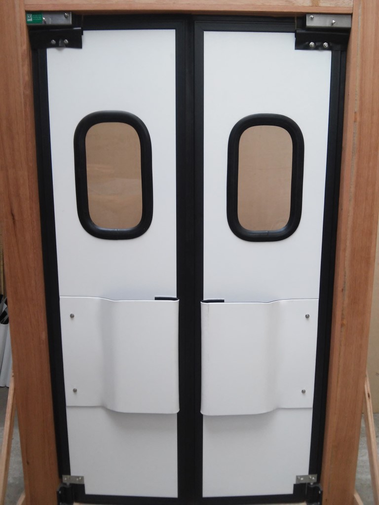 Porta Vaivém ABS ISOPOWER rígido de 16mm de espessura, visor transparente em policarbonato, sistema vai e vem, borracha de vedação em elastômero (em toda extensão da porta) e acabamento em aço inox.